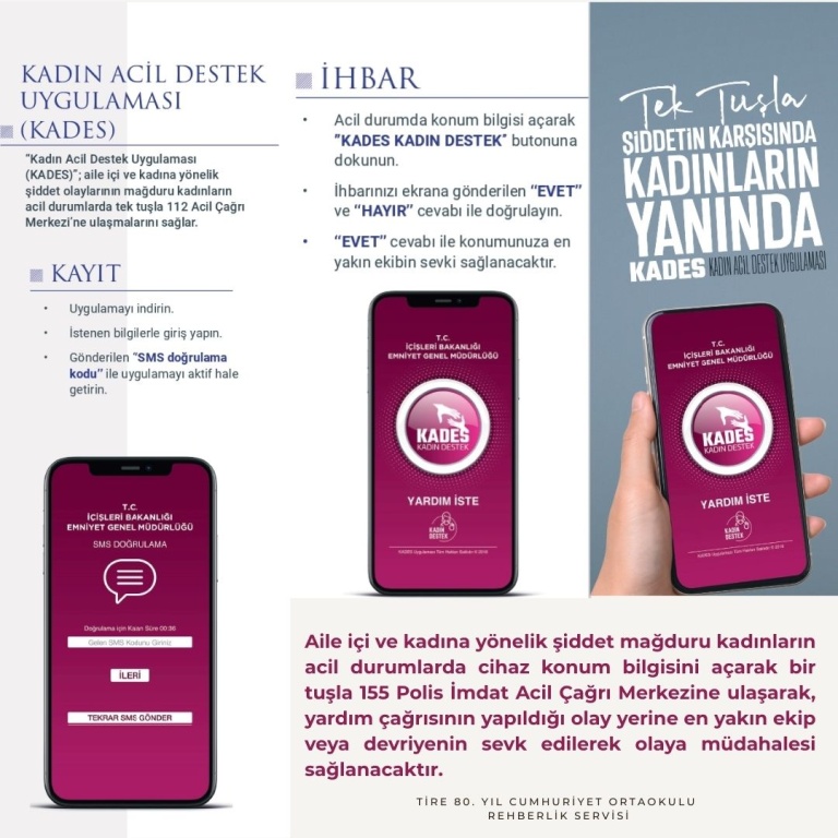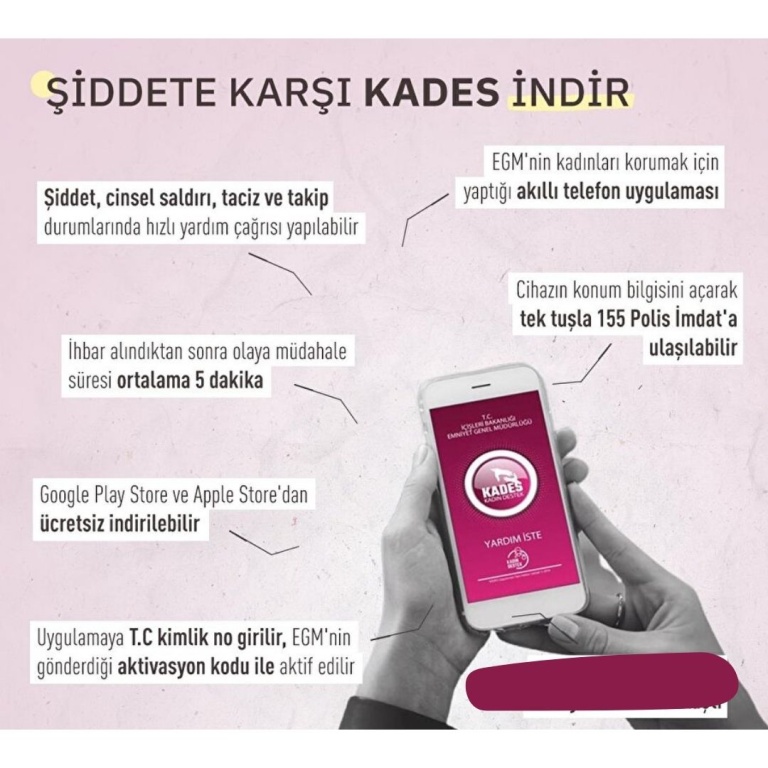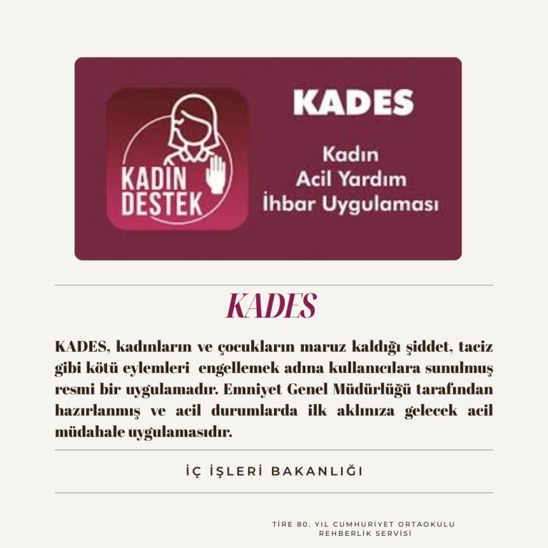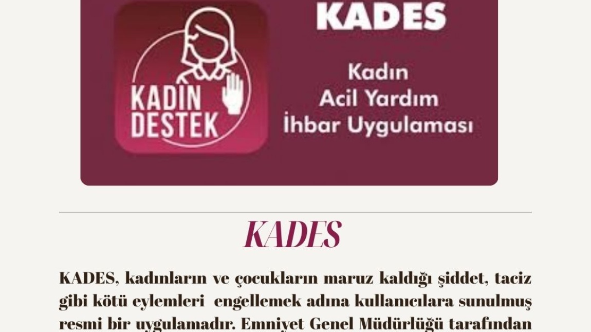Emniyet Genel Müdürlüğü tarafından geliştirilen KADES (Kadın Destek Uygulaması), şiddet gören veya şiddet görme riski altında olan kadınların ve çocukların acil durumlarda yardım alabilmesini sağlayan ücretsiz ve güvenli bir mobil uygulamadır.